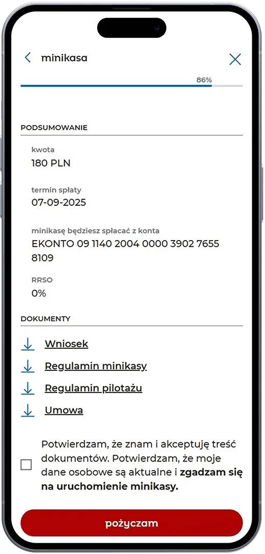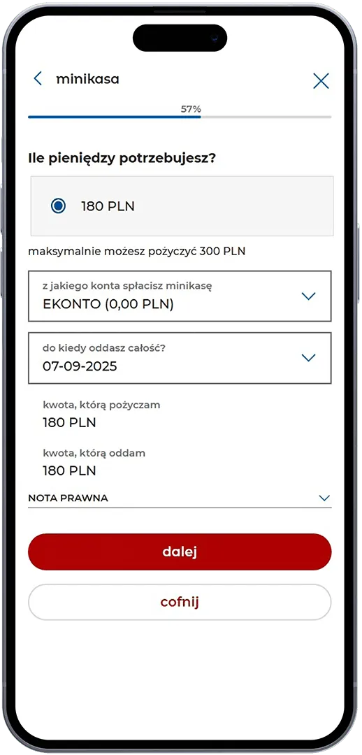 To nie jest oferta. Produkt dostępny jest obecnie w ramach programu pilotażowego wyłącznie dla wybranej grupy klientów Banku. Możesz wnioskować o minikasę wyłącznie w aplikacji mobilnej, jeżeli otrzymałeś od nas taką propozycję i na dzień złożenia wniosku nie ukończyłeś 26 roku życia.
