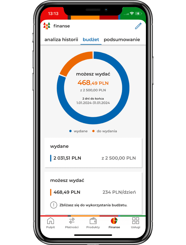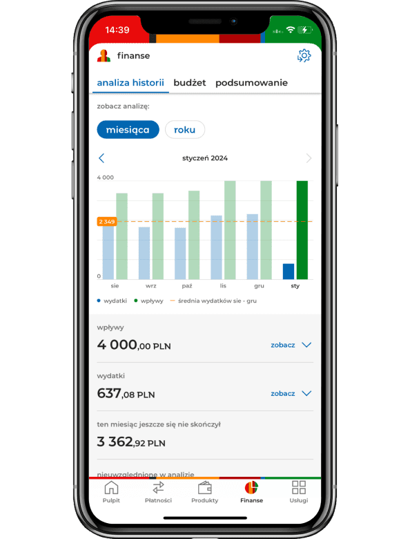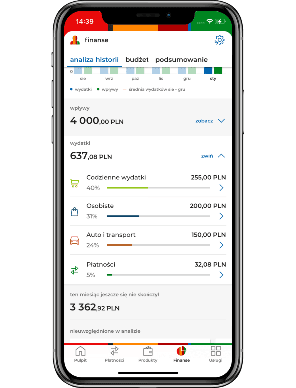 Poznaj intuicyjne narzędzie w aplikacji, które ułatwi Ci sprawdzanie i planowanie wydatków. Z menedżerem finansów łatwo ustalisz, na co wydajesz najwięcej, jakie masz nawyki zakupowe oraz stałe płatności.