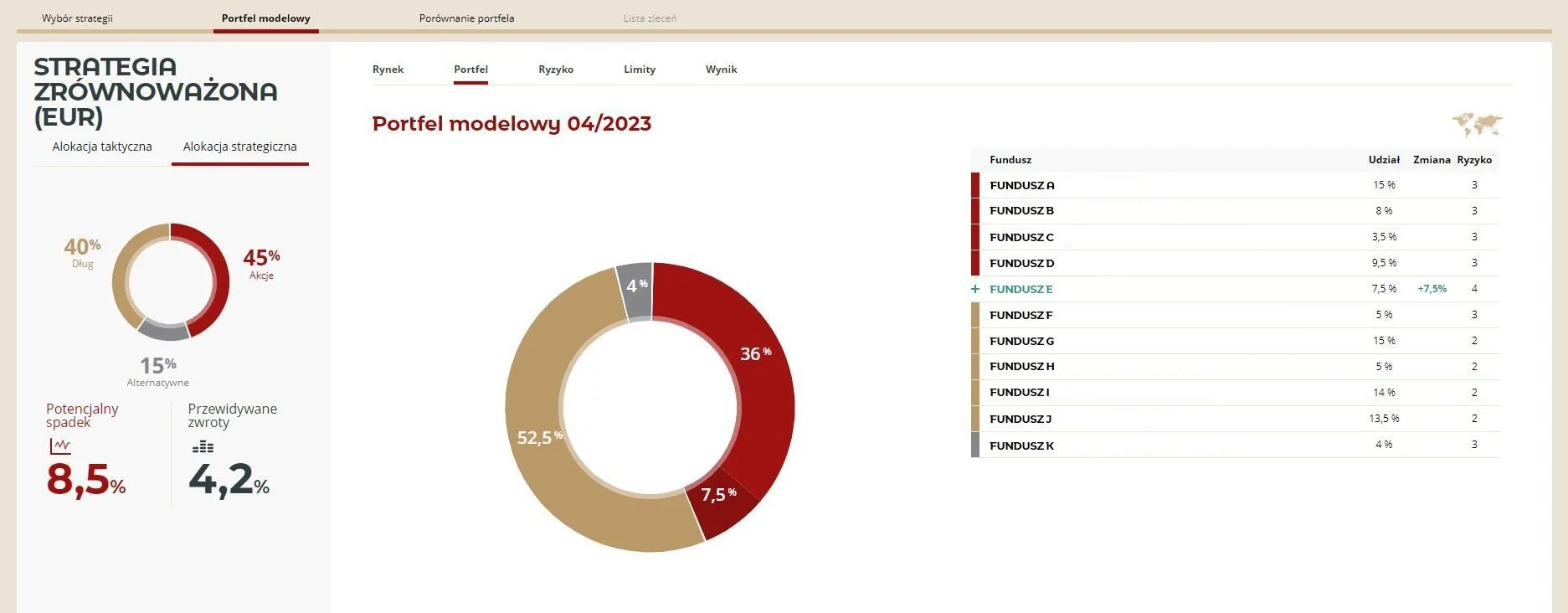 W trakcie sesji zostanie Ci przedstawiony skład rekomendowanego portfela. Zobaczysz jak aktualnie wygląda modelowy podział między klasy aktywów oraz jakie zmiany zaszły od ostatniej rekomendacji.